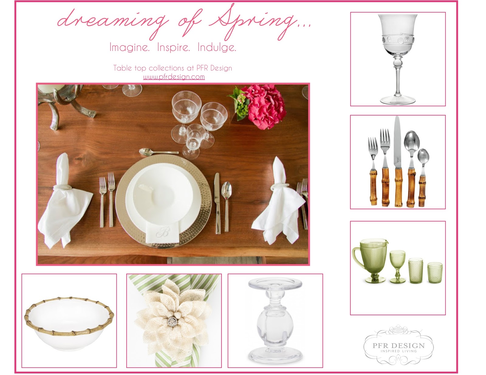 | Dreaming Of Spring Imagine. Inspire. Indulge. Inspired table top collections. www.pfrdesign.com 1. Juliska Graham crystal wine glass 2. Juliska Bamboo 5 piece cutlery set. 3. Cut glass pitcher, goblet, water and old fashioned glasses in green. ( also available in clear & purple) 4. Glass candle holders available in 3 sizes. 5. Juliska Dhalia napkin ring & green linen napkins. 6. Juliska Bamboo cereal bowl All available at www.pfrdesign.com |